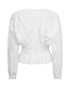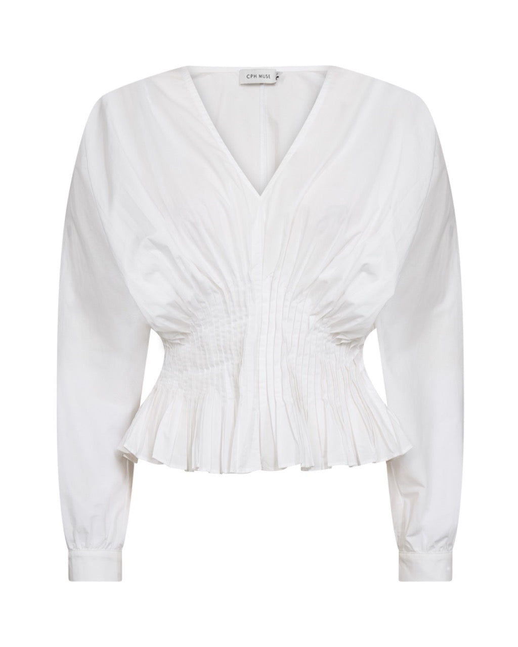 CMPOPLIN-BLOUSE is a blouse in a premium material with a deep V-neck, long sleeves with cuffs and pleats that highlight the waist and contrast the voluminous top. 100% Cotton (organic)